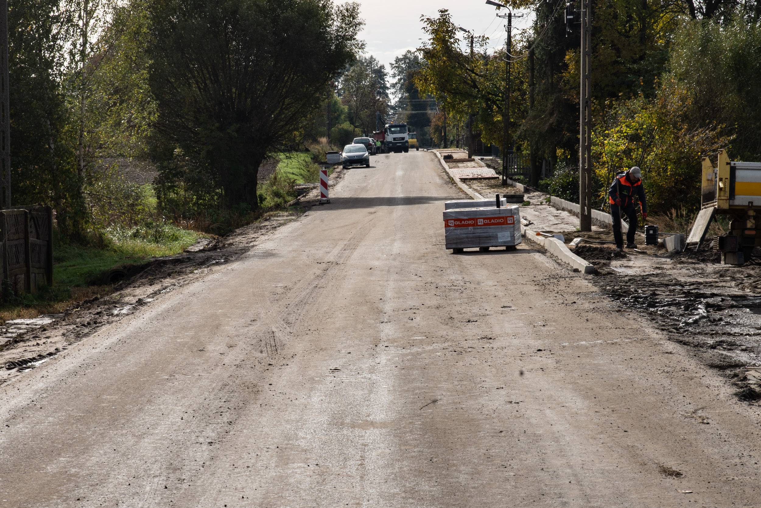 Drogowcy na drogę weszli wiosną. Projekt ma szeroki zakres, bo na odcinku 3,5 km obejmuje wymianę konstrukcji jezdni, położenie nowej, gładkiej nawierzchni, utwardzenie poboczy i odmulenie rowów. Wzdłuż drogi pojawi się chodnik, a przy posesjach – zjazdy. Dla mieszkańców czterech sołectw to wszystko składa się na gigantyczną poprawę bezpieczeństwa.