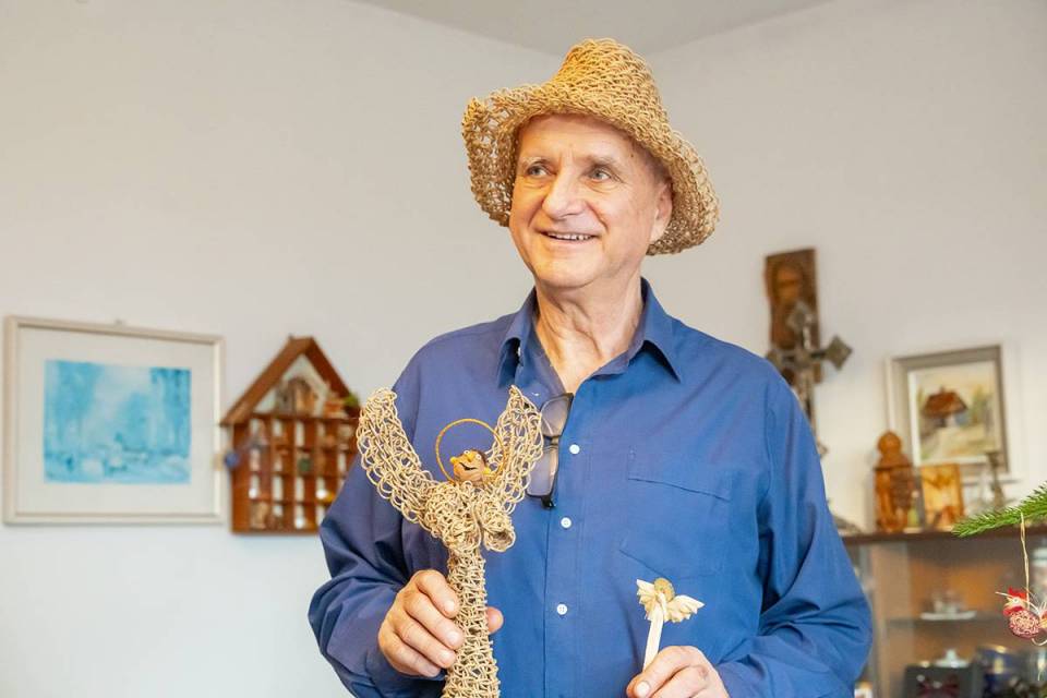 Na jego stoisku oprócz mikroskopijnych szopek i orzechowych dekoracji oraz zabawek, można znaleźć plecionki. Już nie kompozycje z suchymi kwiatami, ale wszystko, co podpowie wyobraźnia. Ze sznurka papierowego tworzy sztukę użytkową – plecaki, torby oraz kapelusze z najsłynniejszym, czyli kapeluszem Pilickim, regionalnym produktem z certyfikatem marki Dolina Pilicy Zwolnij Bieg. Ale są i cylindry, jest kapelusz czarodzieja, pleciony hełm strażacki czy czapka czołgisty.